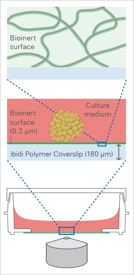 The Bioinert surface is a thin polyol hydrogel layer that is covalently bound to the ibidi Polymer Coverslip #1.5. In contrast to standard ultra-low attachment (ULA) coatings, Bioinert is completely non-adherent and allows no binding of any biomolecule, even in long-term experiments. Therefore, the Bioinert technology provides a stable passivation in cell-based assays for several days or even weeks.