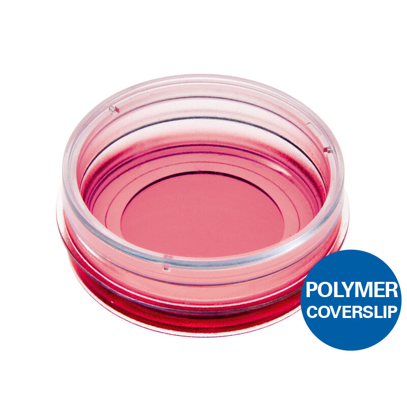 A 35 mm imaging dish with an ibidi Polymer Coverslip Bottom, used in high end microscopy and cell-based assays