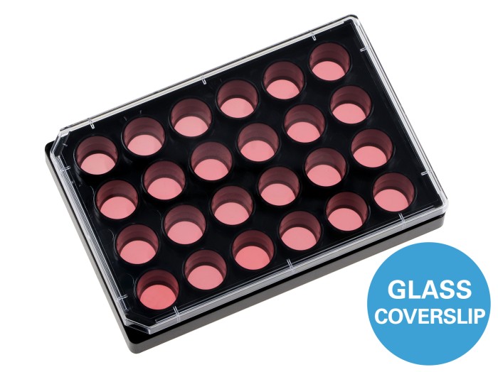The µ-Plate 24 Well Glass Bottom comes with a high precision D263 M Schott glass, No 1.5H (170 +/– 5 µm) Glass Coverslip bottom. This bottom is ideally suitable for high-resolution microscopy and special microscopic applications like TIRF or super-resolution.