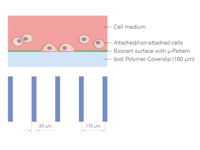 - Precision µ-Patterning – The µ-Slide features an ibiTreat micropatterned surface enclosed by an advanced ibidi Bioinert surface, ensuring selective cell adhesion.