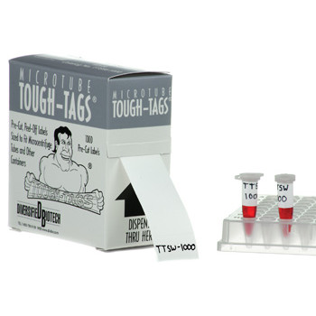 Tough-Tags® are chemically inert labels that strongly adhere to microtubes, test tubes, storage boxes and other microscope slides. They are temperature resistant from 121°C to –40°C and withstand autoclaving, boiling water baths, freezer temperatures, organic solvents and caustic agents. For best adhesion it is recommended that siliconized surfaces be avoided.
