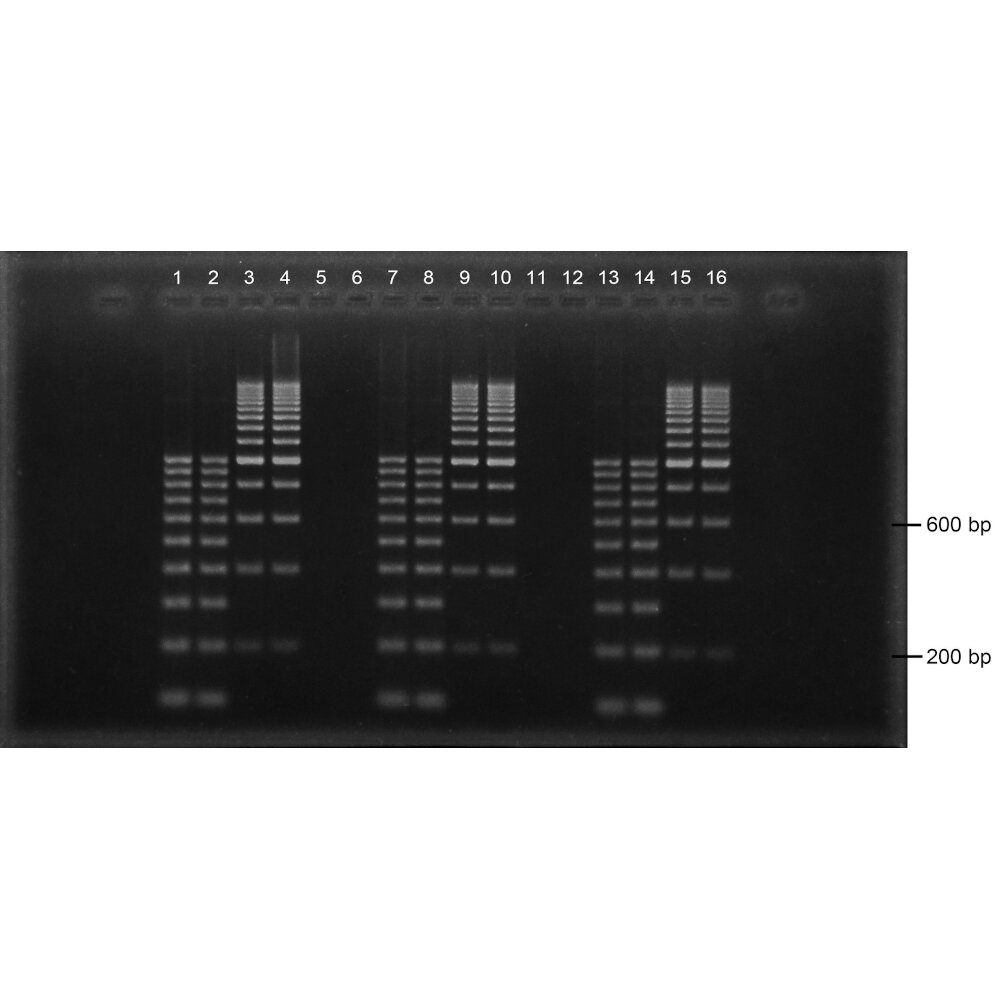 Gel featured in image: 2% Agarose TBE w/ EtBr, Landscape Gel, 16+2 well.