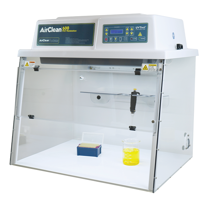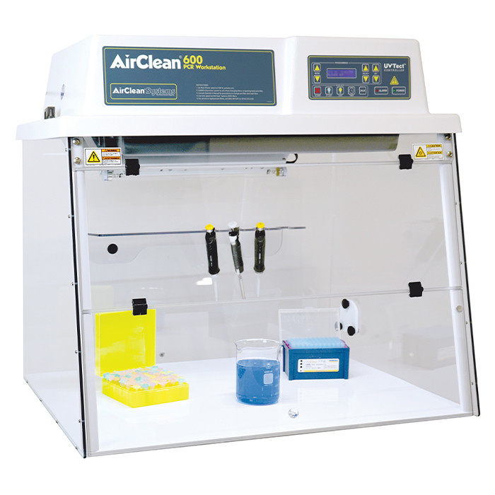 AirClean® Systems AC600 Series PCR Workstations combine ISO 5 HEPA-filtered air with UV light irradiation for the ultimate DNA/RNA manipulation and amplification work area. Cross-contamination during amplification of DNA and RNA can lead to results that are inaccurate, costing the lab technician valuable time and reagents. PCR Workstations minimize this risk by keeping airborne contaminants away from samples and irradiating work surfaces and tools between amplifications.