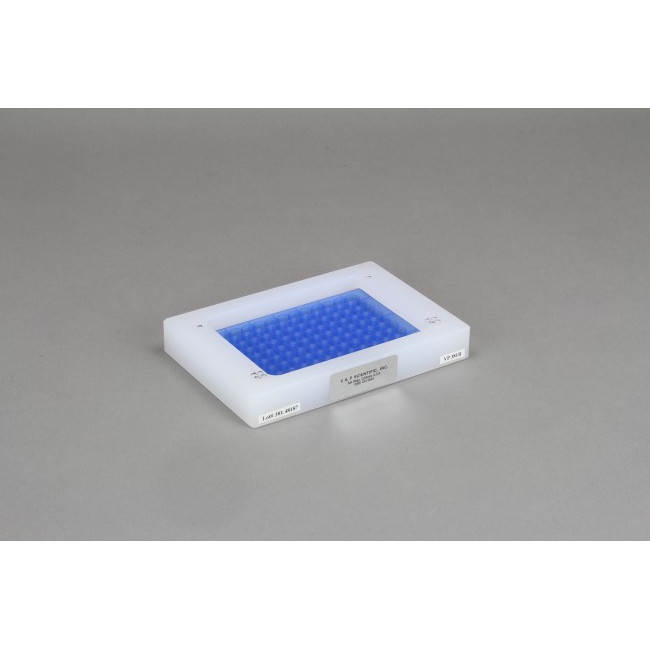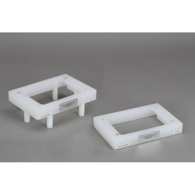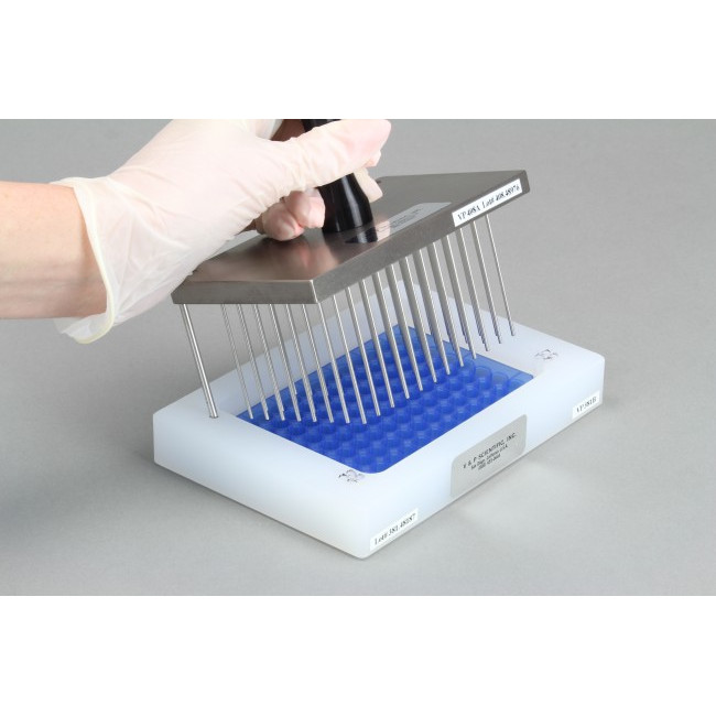 The VP 381A Deep Well LIBRARY COPIER™ and the VP 381B conventional microplate LIBRARY COPIER™ have larger alignment holes to accommodate the larger diameter guide pins on Deep Well MULTI-BLOT™ Replicators. The VP 381A was designed to fit over Deep 96 and 384 Well Microplates while the VP 381B was designed to fit over conventional microplates and aid in reformatting libraries from deep well microplates to 384 well microplates.