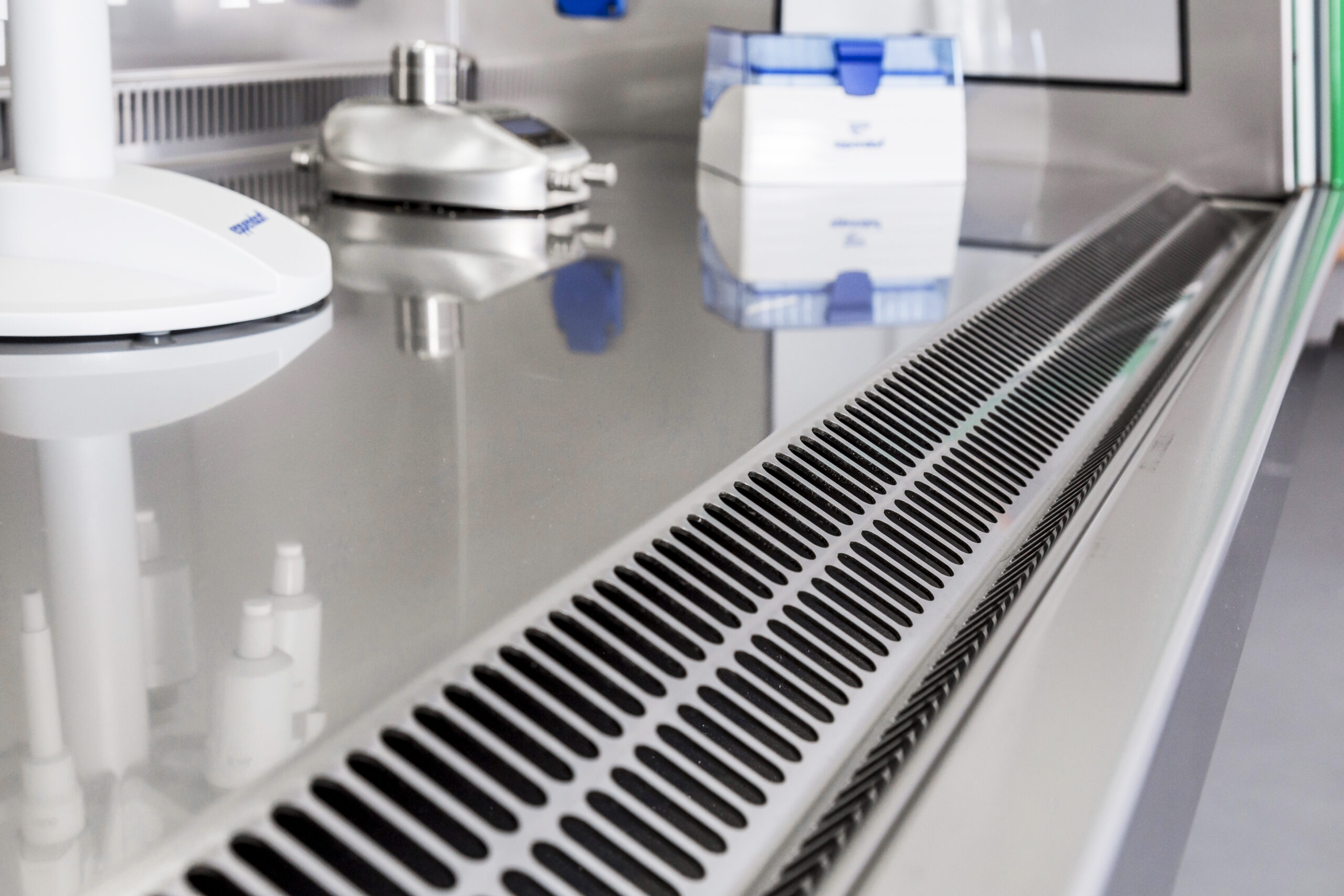 The interior of the work area is made entirely of AISI 316L grade stainless steel in a seamless design with rounded sides to minimise the number of surfaces posing a risk of contamination.