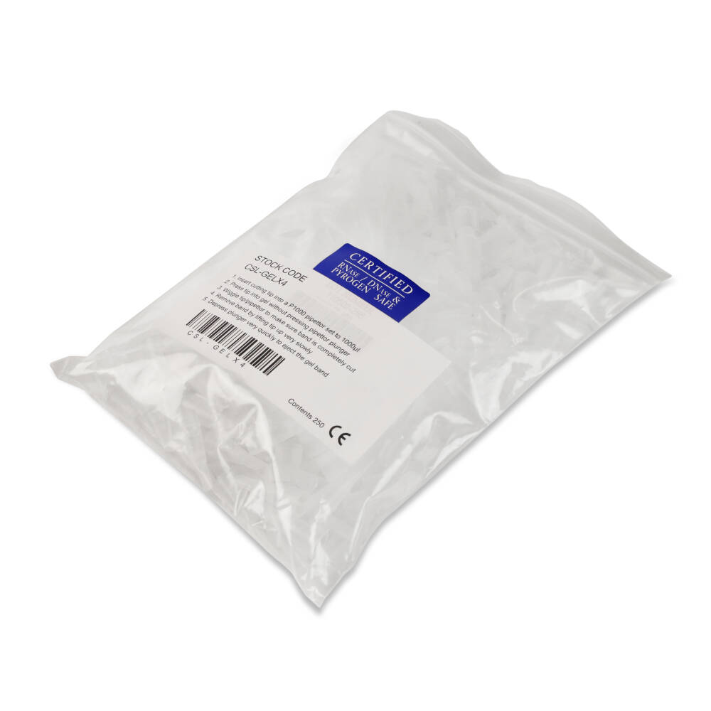 An excellent tool for gel extraction, Cleaver Scientific GelX Disposable Gel Excision Tips offer a unique and convenient way to excise nucleic acid and protein bands from gels. GelX tips allow completely safe and contamination free removal of the gel band of interest without the need to handle potentially dangerous scalpels. The gel band is neatly extracted and contained in the tip, where it can then be dispensed into a tube for further analysis. Once used, the tip is ejected for disposal.