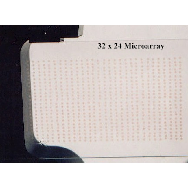 The glass slide in photo #3 illustrates the 768 spotting pattern on a silanated glass slide made by Xenopore. This slide was photographed against a white background to better illustrate the spots.