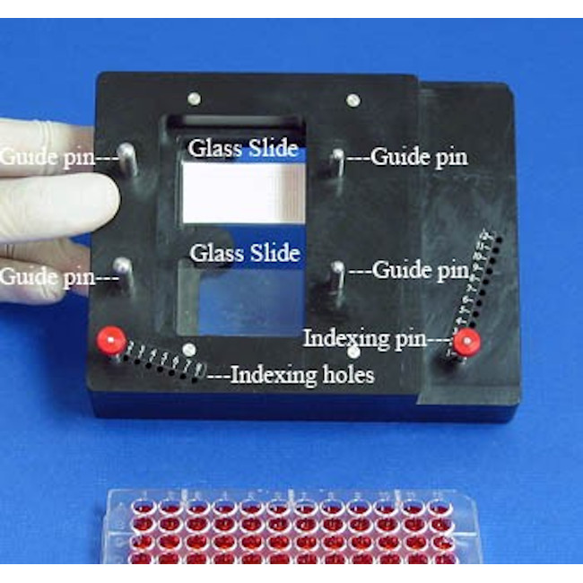 Glass Slide Indexing System for microarrays, uses 1" x 3" or 25mm x 75mm glass slides, compatible with standard FP1S6 pins