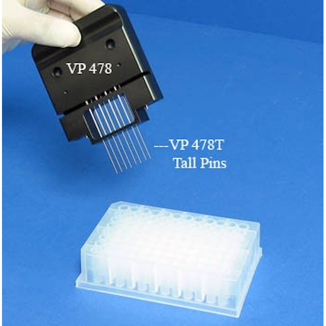 Glass Slide Replicators with longer pins to reach the bottom of some tall PCR plates are now available as well as a specially adapted Glass Slide Indexer for accommodating the longer pins. Just order the VP 478T with longer FP1S6T pins see photo #13.