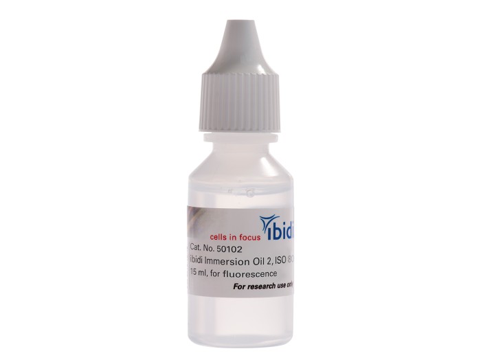 An immersion oil for fluorescence microscopy that is fully compatible with all µ-Slides, µ-Dishes, and µ-Plates