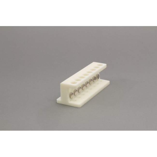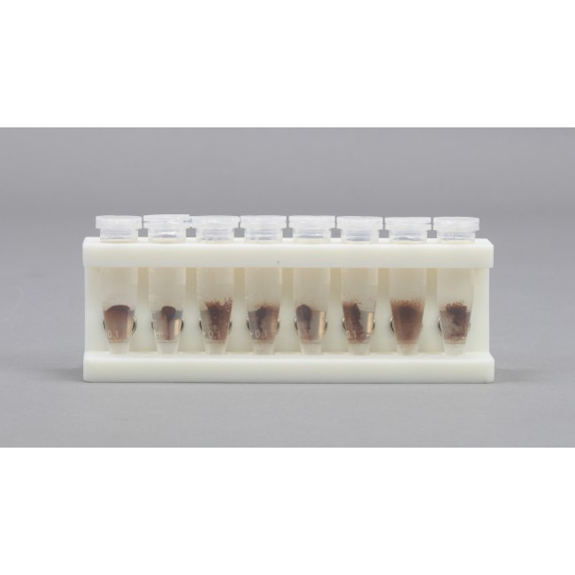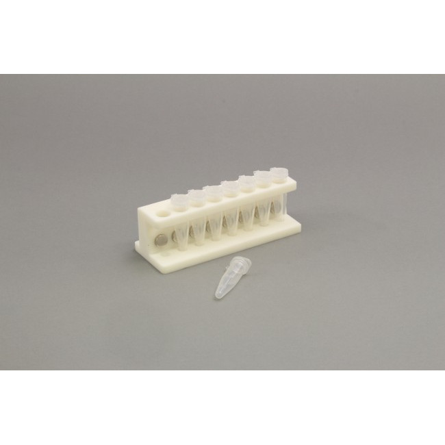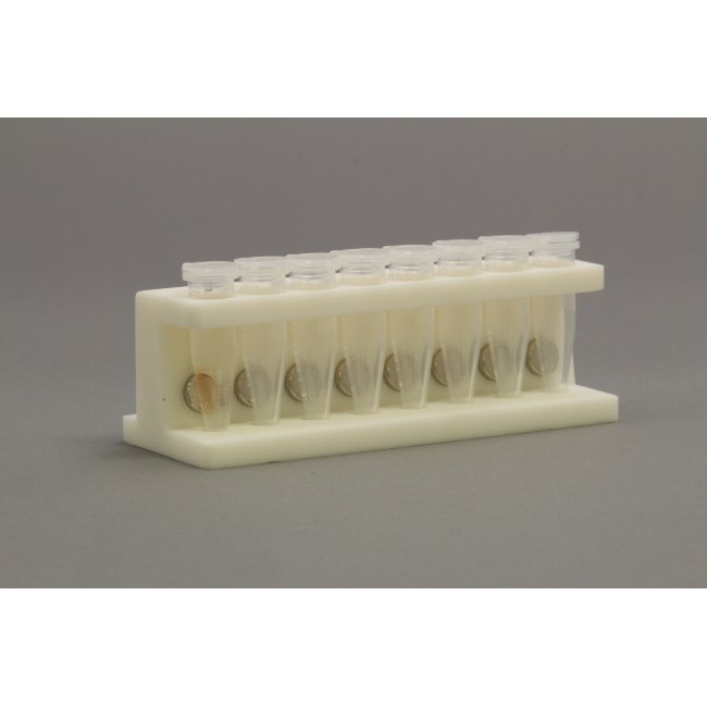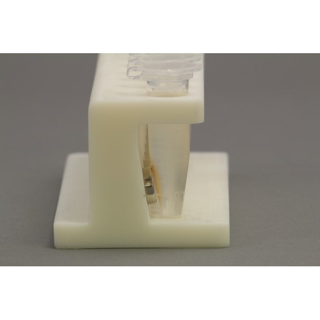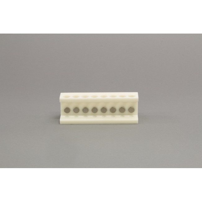 Magnetic Bead Separation Rack, 3D Printed for 8 1.5 ml microcentrifuge tubes in a row, with 16 magnetic cylinders(2 per tube), angled to match the shape of the conical tube, 52 MGO NdFeB, pulls magnetic beads to side of tube.