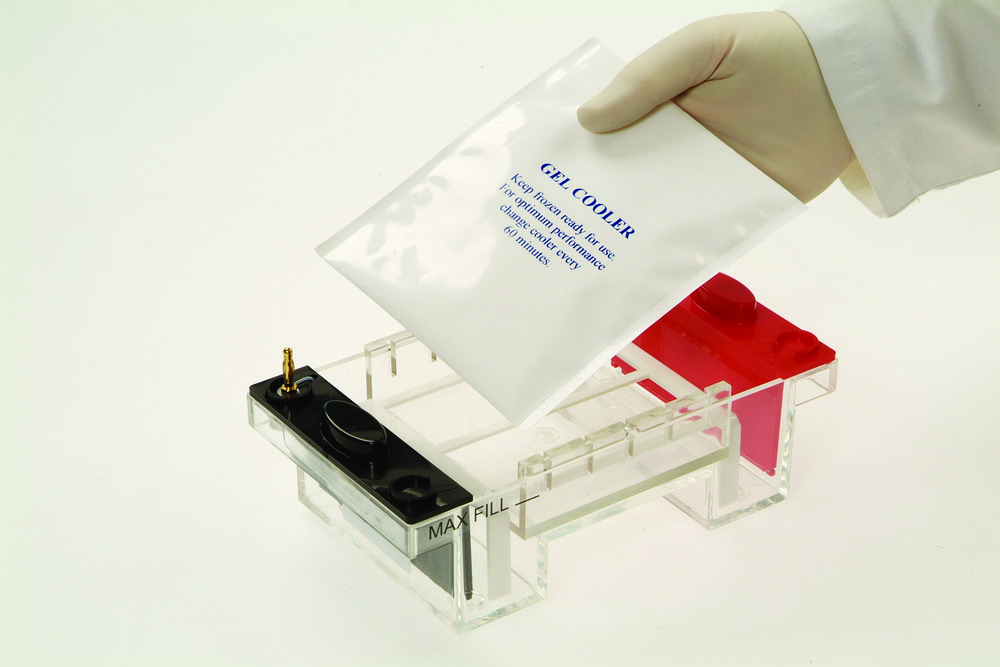 This innovative system features a detachable gel platform, and a cooling pack designed to cool the buffer chamber of horizontal gel tank without the need for external cooling equipment. To use, simply position the platform over the running tray and place the pre-chilled cool pack on top. The cool pack rests above the gel in the buffer, efficiently absorbing and dissipating any heat generated during the process. This straightforward and efficient cooling method can improve sample resolution and accelerate the migration of samples through the gel, reducing run times.