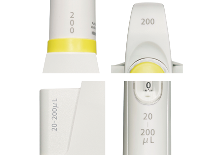 The pipette volume (Cat. No.) is recognized in one glance by volume notation of 4 positions.