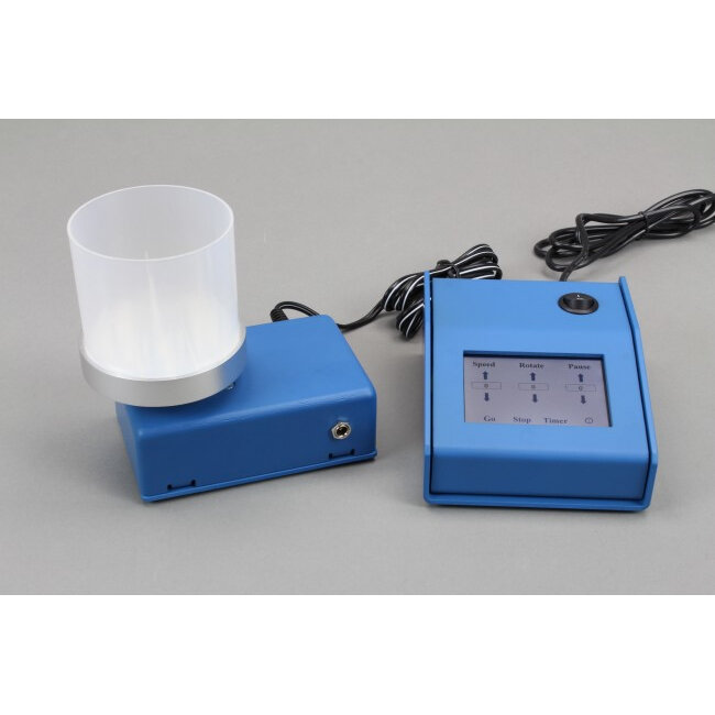 Our unique method of mixing and suspending particulates is predicated on fluid dynamics and flow geometry. Our method of mixing is achieved by integrating radially oriented side fins and projections in a vessel and connecting the vessel to a machine that alternately reverses the vessel’s spin direction to generate a circular pulsed radial fluid flow. The flow path starts at the bottom of the vessel, where the fluid and particulates are pushed to the side walls of the vessel. As the fluid and particle mixture strikes the side wall, the side fins guide the fluid flow up the vessel, thus generating lift along the vessel walls. The fluid flow loop is completed by the mixture flowing down the center of the vessel due to gravity and the nature of radial flow.