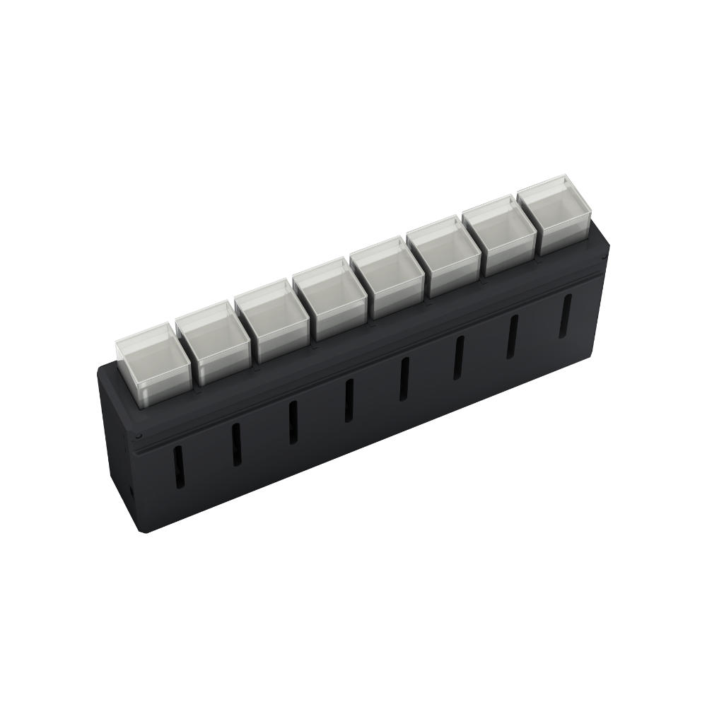 Standard Cuvette Adapter: An adapter for the ScanDrop2 is also available that can accommodate up to 8 different 10 mm cuvettes. Automatic sample positioning based on previously defined center heights makes it possible to use 10 mm cuvettes with different center heights (8.5 mm, 12 mm or 15 mm).