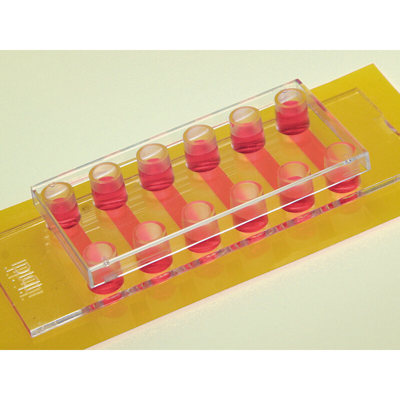 A bottomless 6 channel slide used for cell culture applications with a self-adhesive underside to which own substrates can be mounted