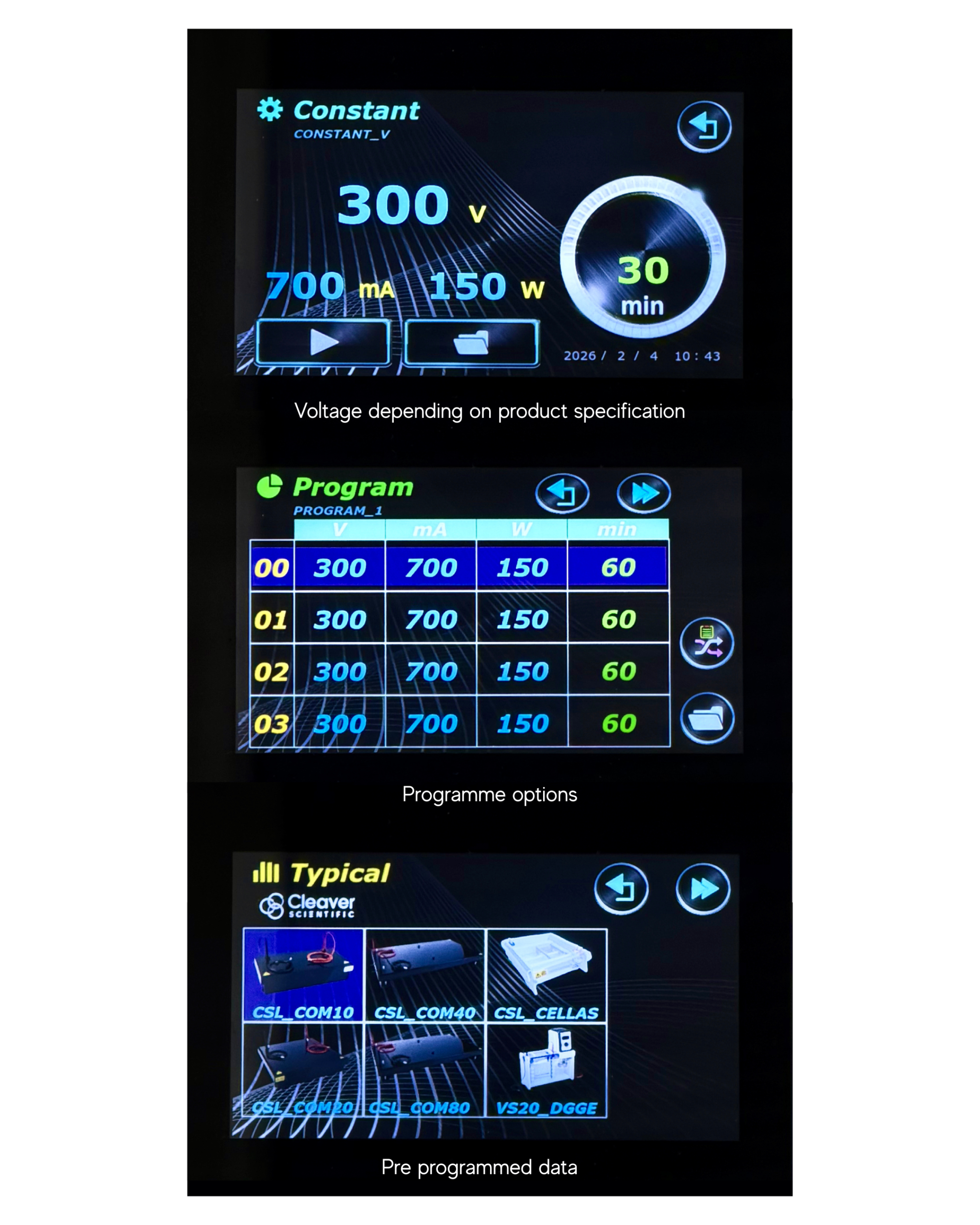 Electrotransfers may be performed as timed runs in constant or programmable mode via an intuitive touch screen interface to prevent overheating and buffer depletion. A run time extendable to a maximum of 999 minutes in constant mode is also useful for overnight transfers undertaken at constant low current in wire electrode systems.