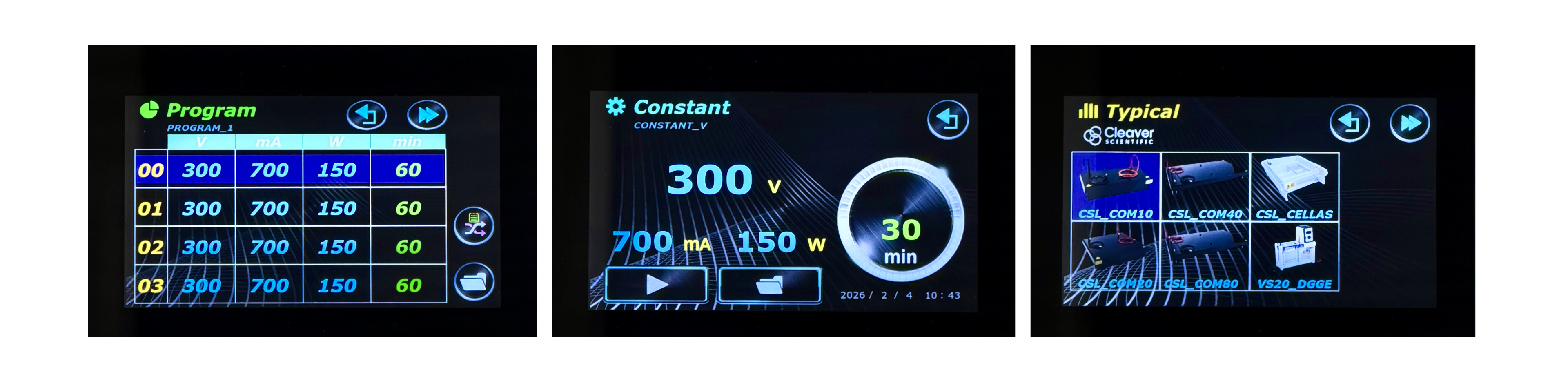 The PowerPro 500-M2 features built-in pre-set protocols for each of Cleaver Scientific’s electrophoresis systems and allows users to create and save protocols for their own systems. A touch screen displays current running parameters and enables easy navigation of pre-set and saved protocols. The PowerPro 500-M2 can be operated at constant voltage, constant current, or constant power. A convenient pause/resume function allows any run to be temporarily halted for gel inspection and restarted from the same position.